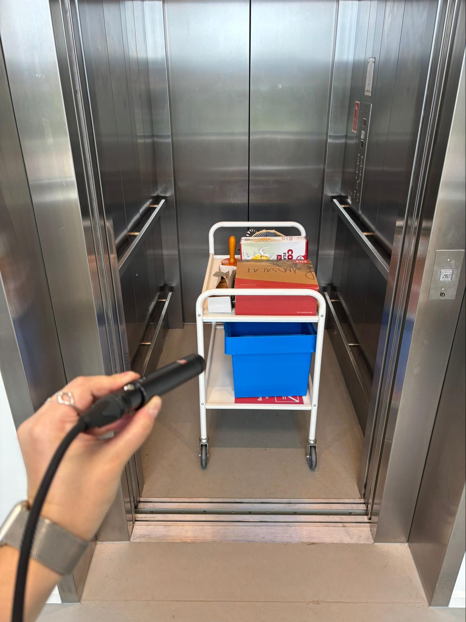 [Photo by Rikke Rømer – recording a cart in an elevator]